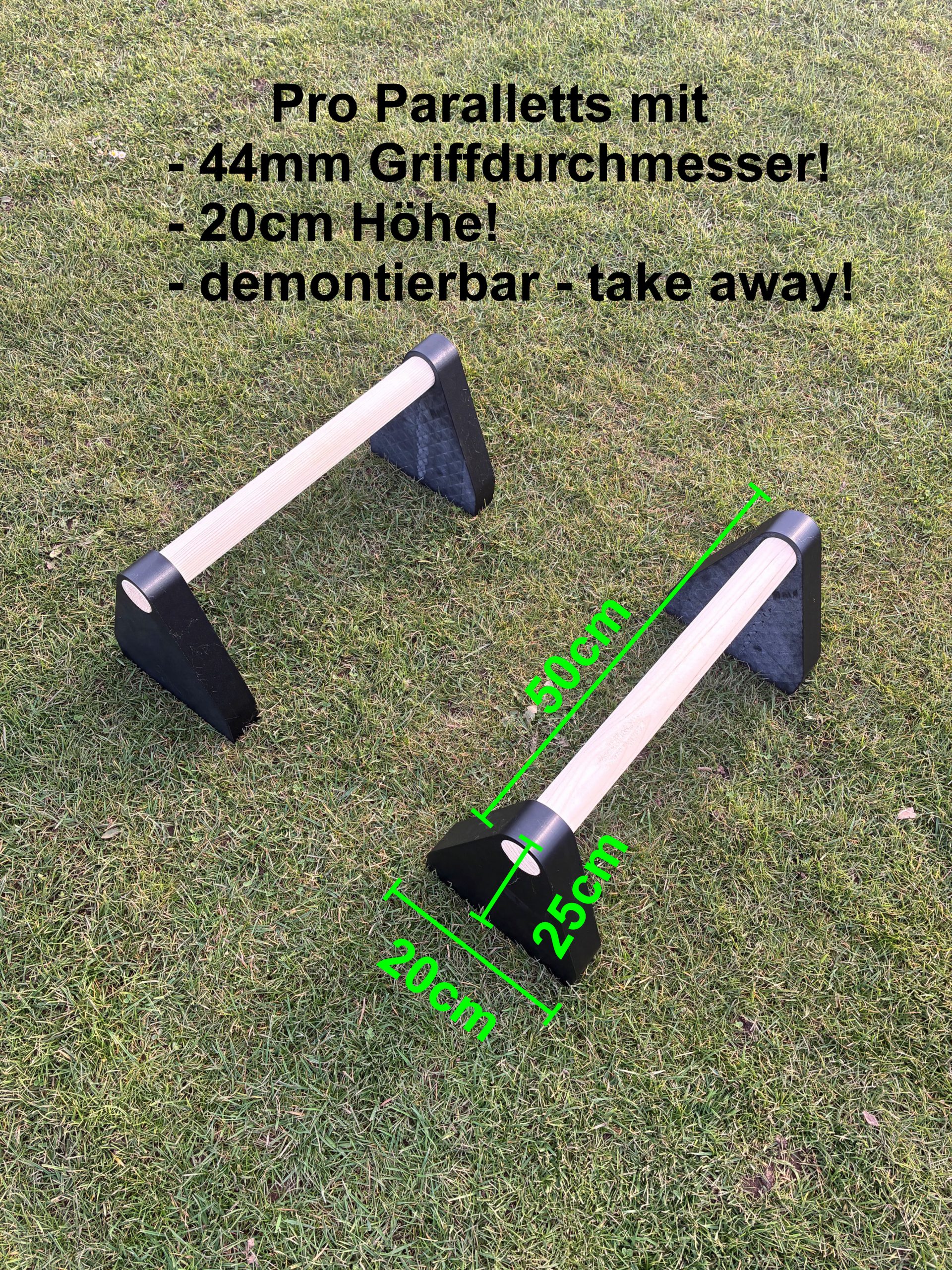 Mit einer Länge von 50 cm und einer Höhe von 20 cm bieten die Parallettes optimale Hebelverhältnisse für saubere Bewegungen und maximale Kontrolle. Sie sind leicht, kompakt und lassen sich problemlos verstauen oder transportieren.